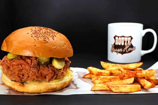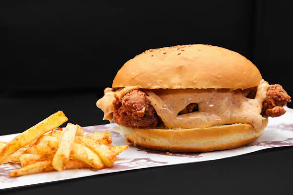 Özel kaplamalı kızarmış tavuk, özel burger sos ve ev yapımı mayonezli acı sos.