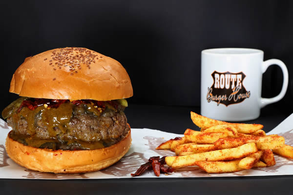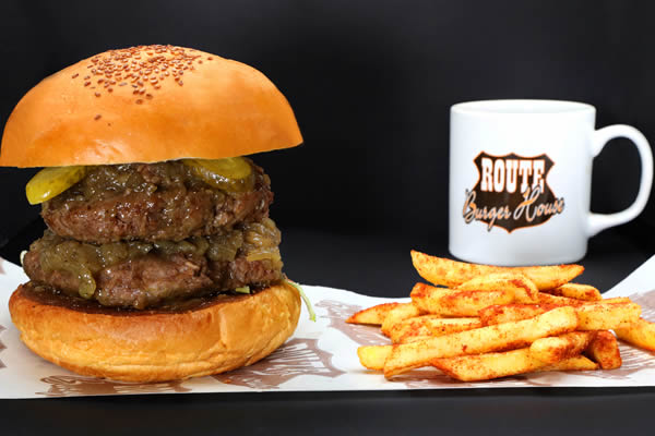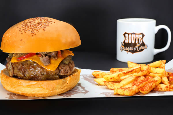 Hamburger Köftesi, Karamelize Soğan, Cheddar Peyniri, Kavurma ve Köz Biber ile.