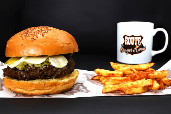Burger Köftesi, trüflü kuru domates pestosu, double cheddar peyniri, kırmızı soğan ve turşu.