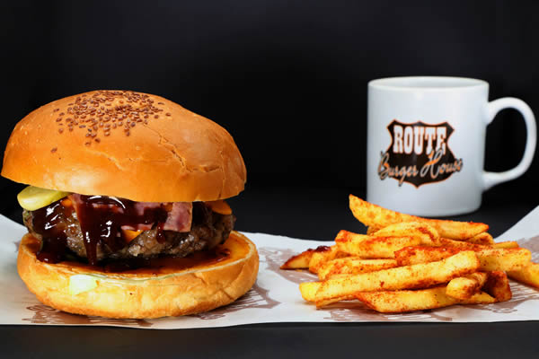 Hamburger Köftesi, Turşu, Karamelize Soğan, Dana Bacon, Cheddar Peyniri ve Barbekü Sos.